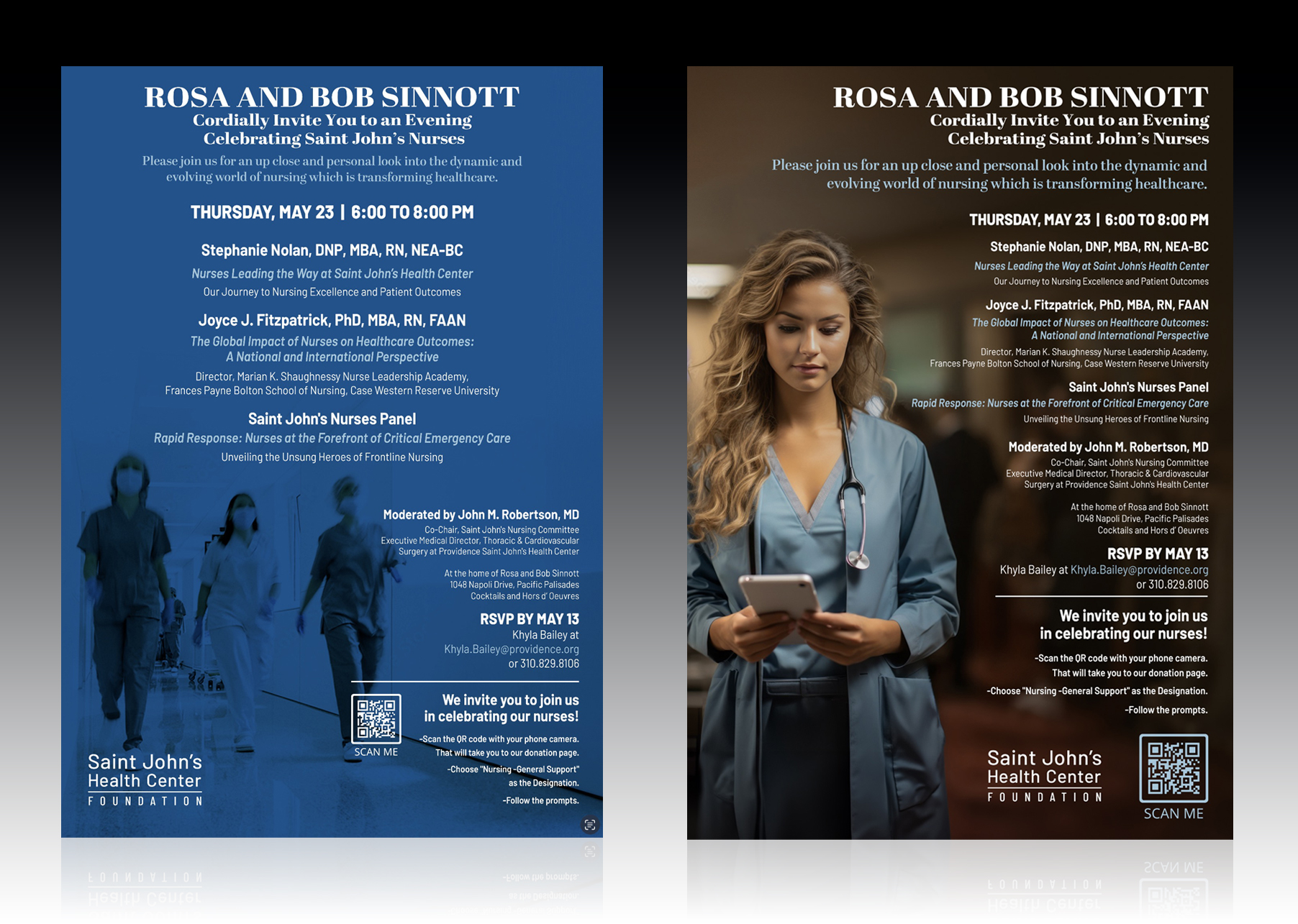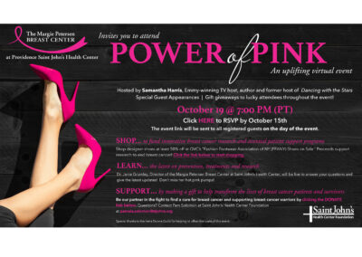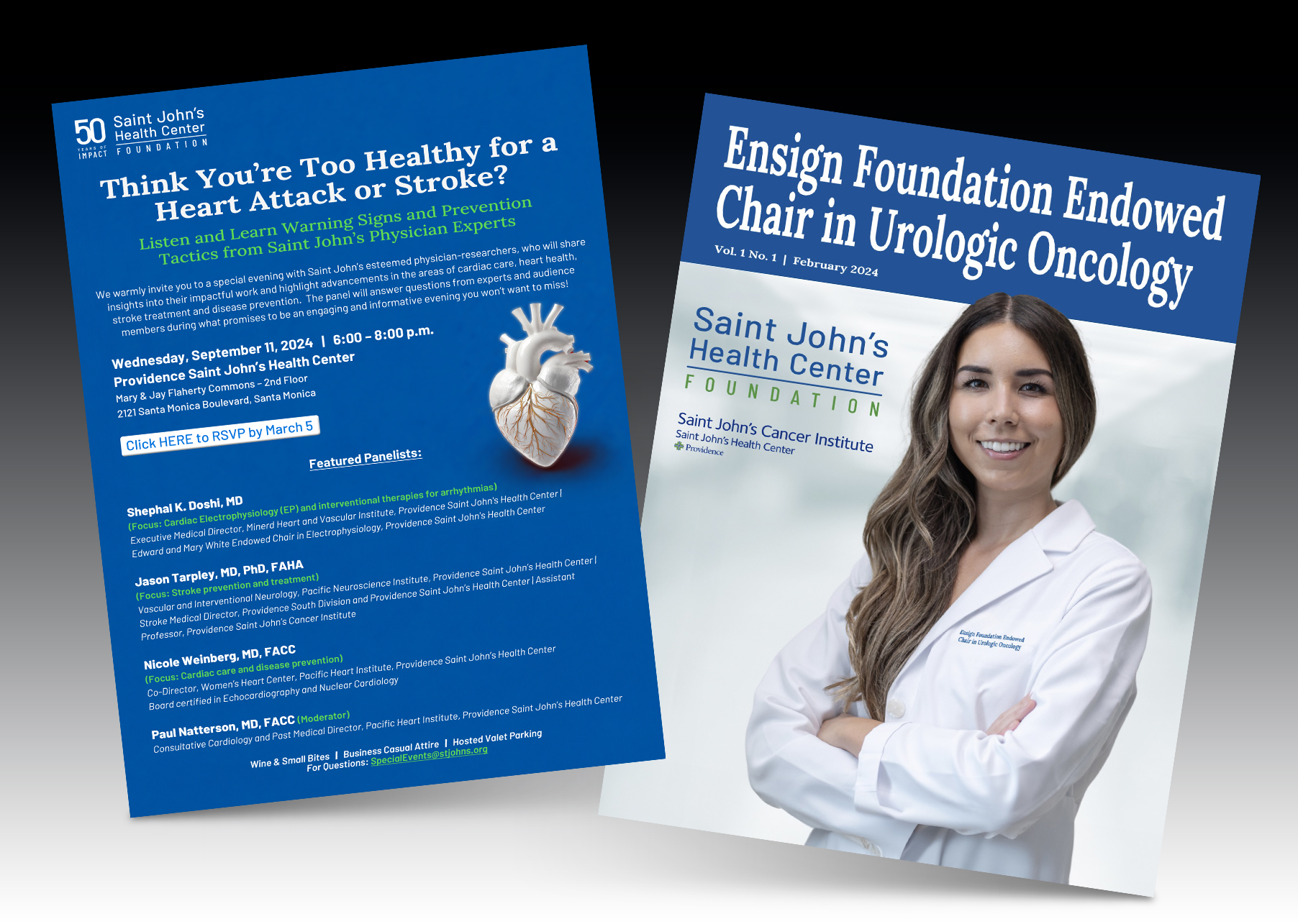 Since July 2020, I have worked offsite as a freelance designer for Saint John’s Health Center Foundation in Santa Monica, CA. Over the past five years, I have specialized in creating targeted campaigns for key stakeholders, including physicians, trustees, and donors. My work has included the design of digital and print invitations, response forms, event video presentations, branded collateral, signage, and engaging email campaigns. These ongoing contributions have played a consistent role in enhancing outreach efforts and strengthening stakeholder engagement across the organization.